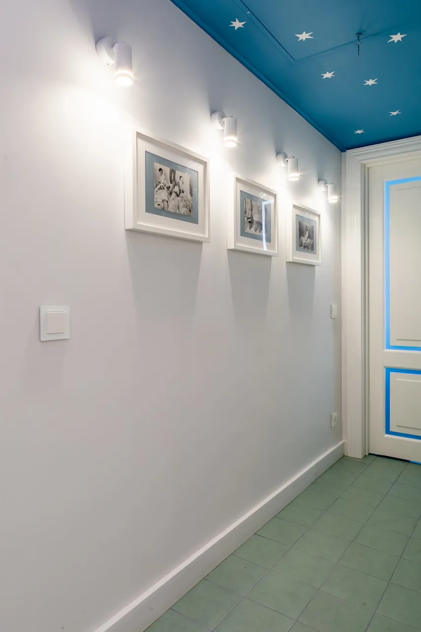 Переделка началась с создания новых форм, которые преобразили пространство. В зоне коридора появилась арка с шаром, добавившая динамики помещению. Кухня получила блок с арочной вытяжкой, повторяющей форму архитектурных элементов, и монолитной столешницей, уходящей в пол. Белый и синий цвета добавили легкости интерьеру, превратив его в эклектичный, но при этом гармоничный ансамбль.